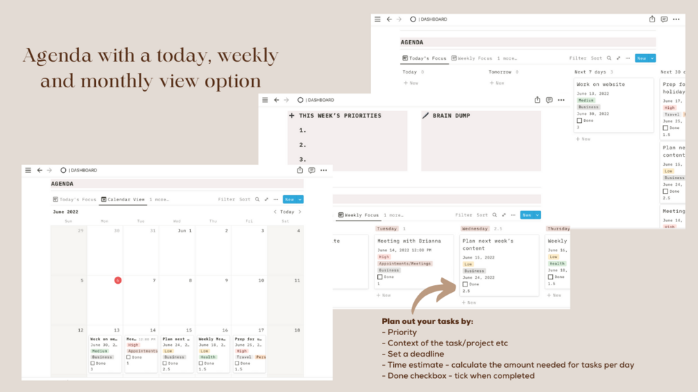 - Agenda; with options of a daily, weekly and monthly view of all tasks, goals, projects, appointments/meetings etc.